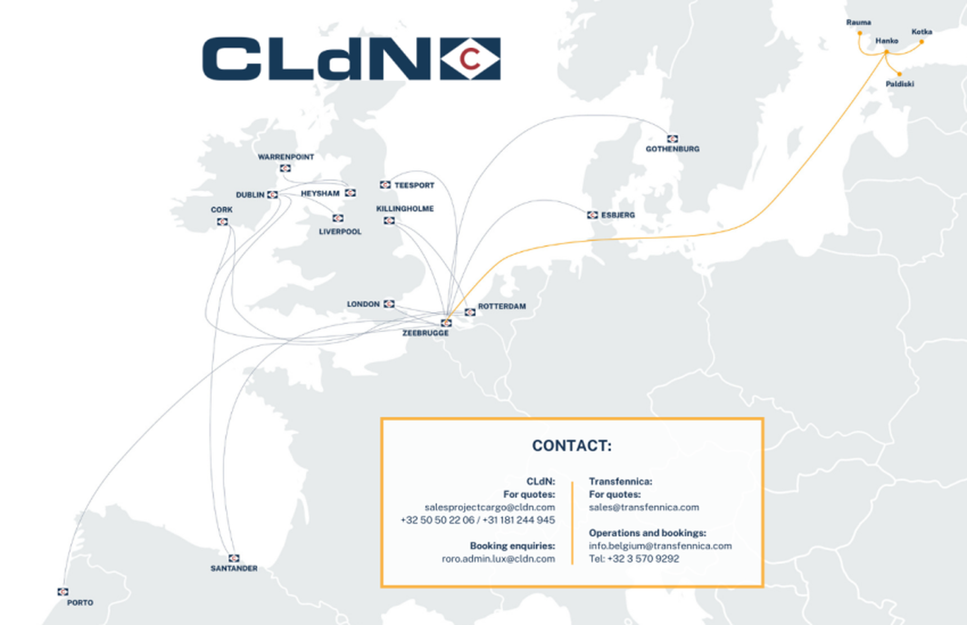 CLdN and Transfennica are pleased to announce a connection of their shipping services in Zeebrugge to provide customers with broader connections through Northern and Western Europe. Transfennica’s Northern Baltic service between Antwerp and the ports of Hanko, Kotka, Rauma (Finland) and Paldiski (Estonia) will call at CLdN’s Albert II terminal in Zeebrugge every other Thursday enabling the exchange of northbound and southbound cargo. The first call is scheduled for Thursday 25th July.